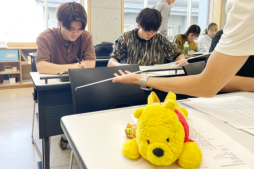学生たちはハッとし、授業で学んだ法規や床面積・採光面積の知識を思い出しながら、プランを練り直します。互いに情報を共有し合いながら、試行錯誤する姿は「やっぱりインテリアデザインが好きなんだな」と感じさせてくれます。教室には、学生たちを応援するかのようなかわいらしい熊のぬいぐるみや青い毛むくじゃらの筆箱も置かれています。