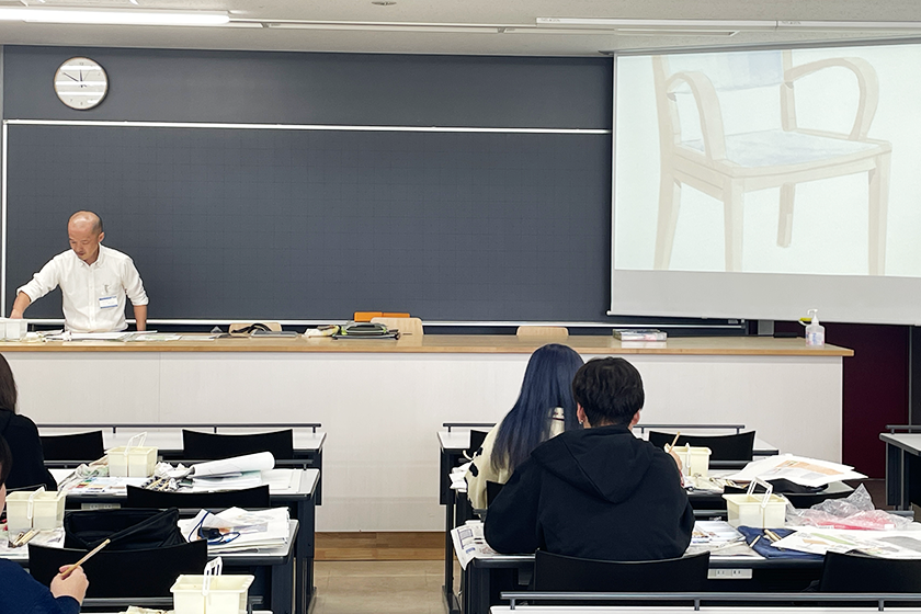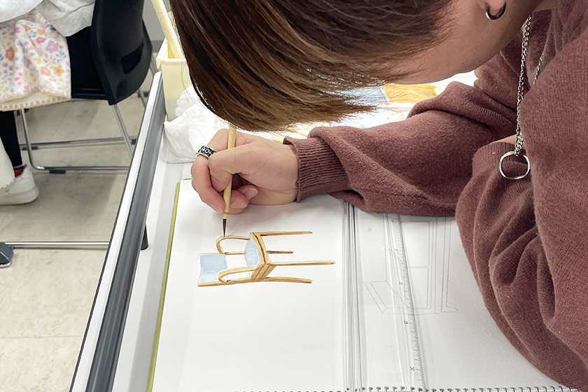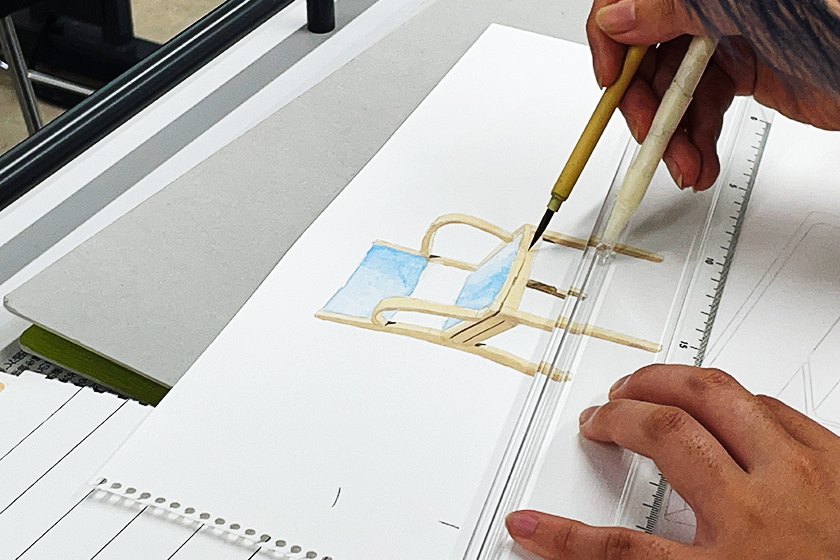 後期の「レンダリング」の授業では、透明水彩を使った着彩が始まりました。図法理解に苦戦した学生も多い前期を経て、今は現役パーサーである講師・清水拓己先生の指導の下、思い思いの作品を描き進めています。透明水彩は調整がしやすく、学生たちも自由に表現を楽しみながらスキルを磨いています。