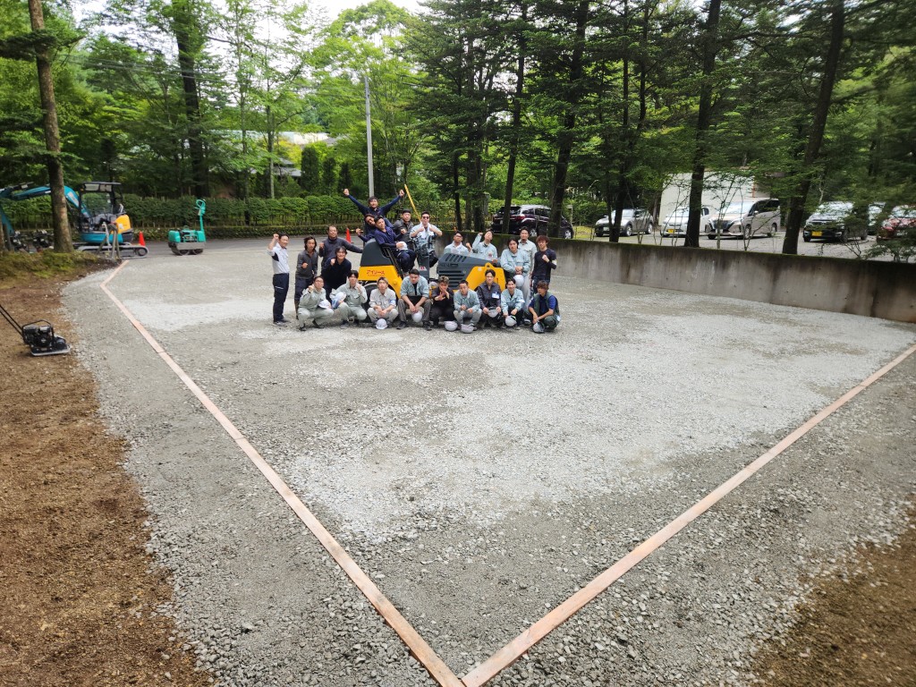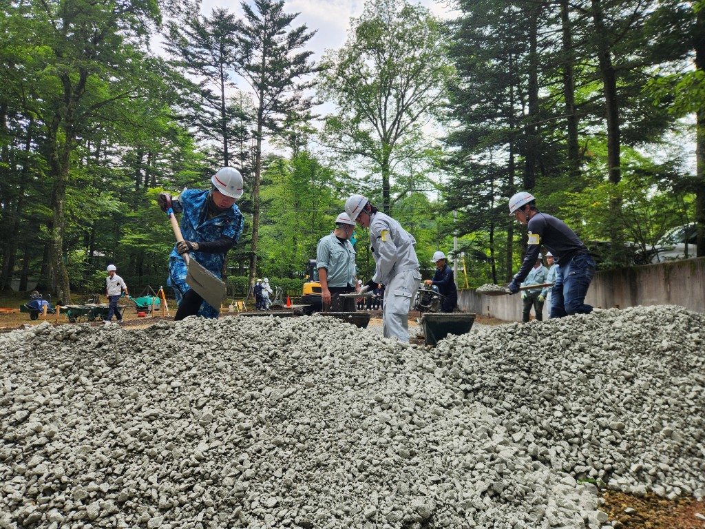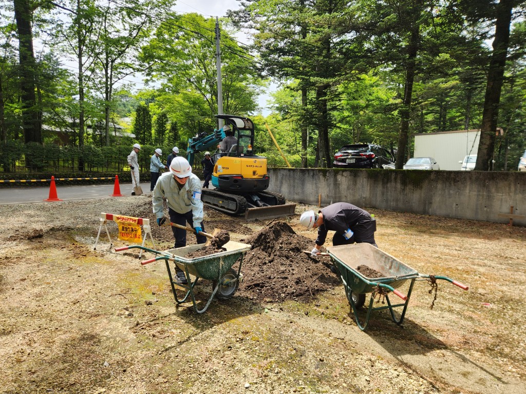 この実習では軽井沢研修所内の雨水が溜まりやすい場所の改良工事を行います。
