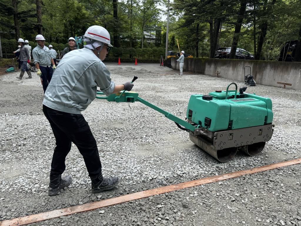 砕石をある程度均等に敷均したら、転圧機を使用して締め固めます。