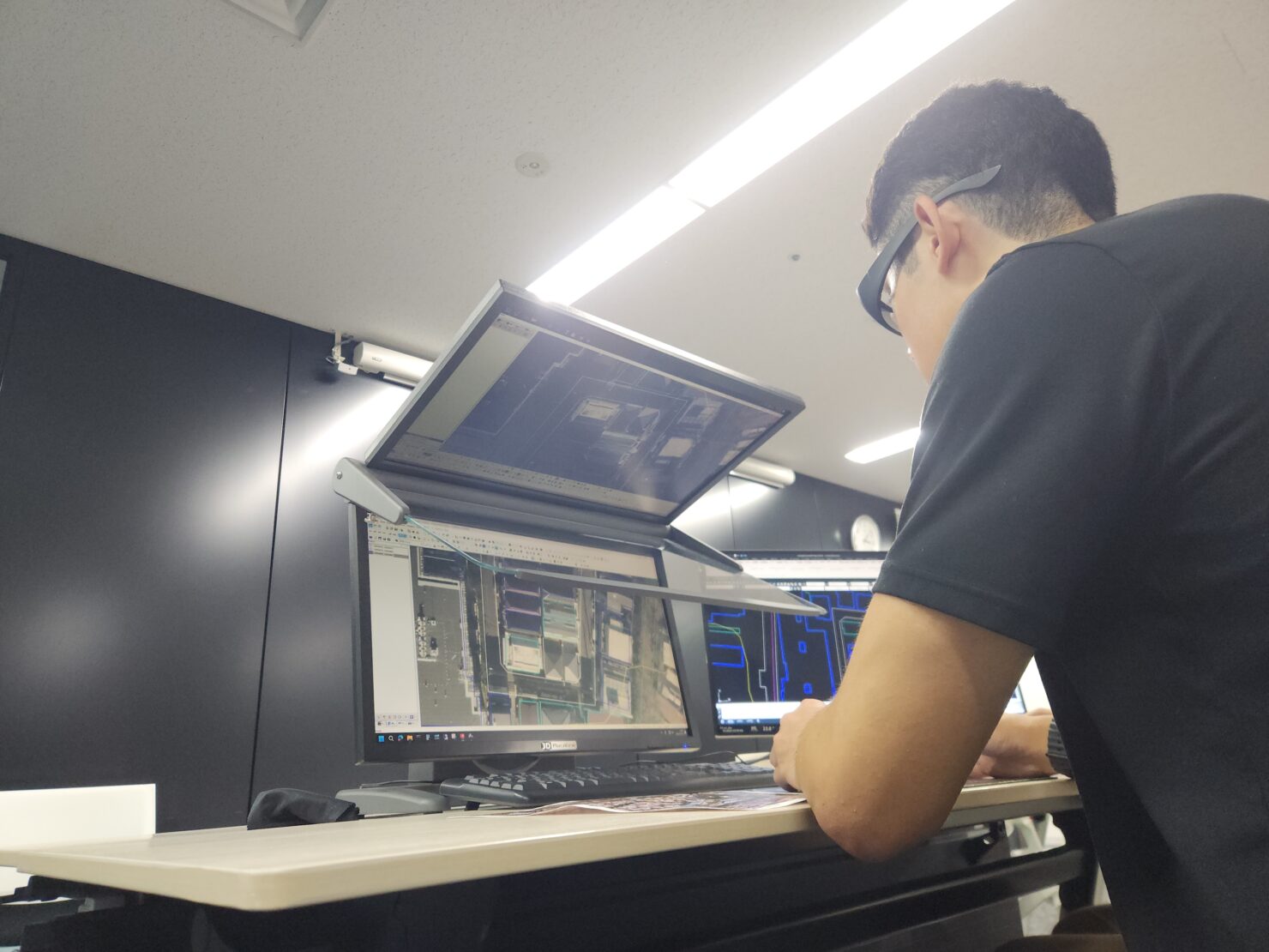 見学先は、株式会社パスコ様。航空写真業界大手の社内にお邪魔して数値図化の実習を行いました。