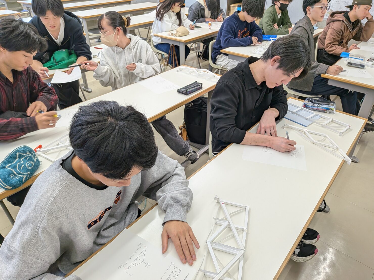 ケント紙を使いトラス構造の模型を作成し、計算だけでは理解しずらいトラス構造の力の流れをトラスの模型を破壊することで学んでいきます。