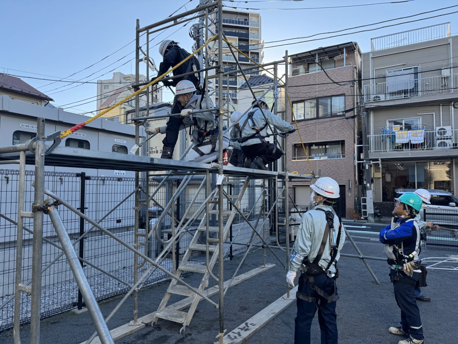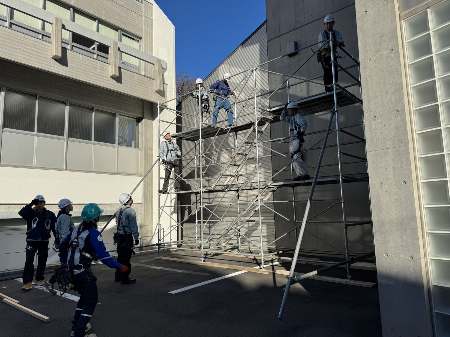 そのなかでも、建設現場にてよく用いられる枠組足場、くさび式足場を実施しました。