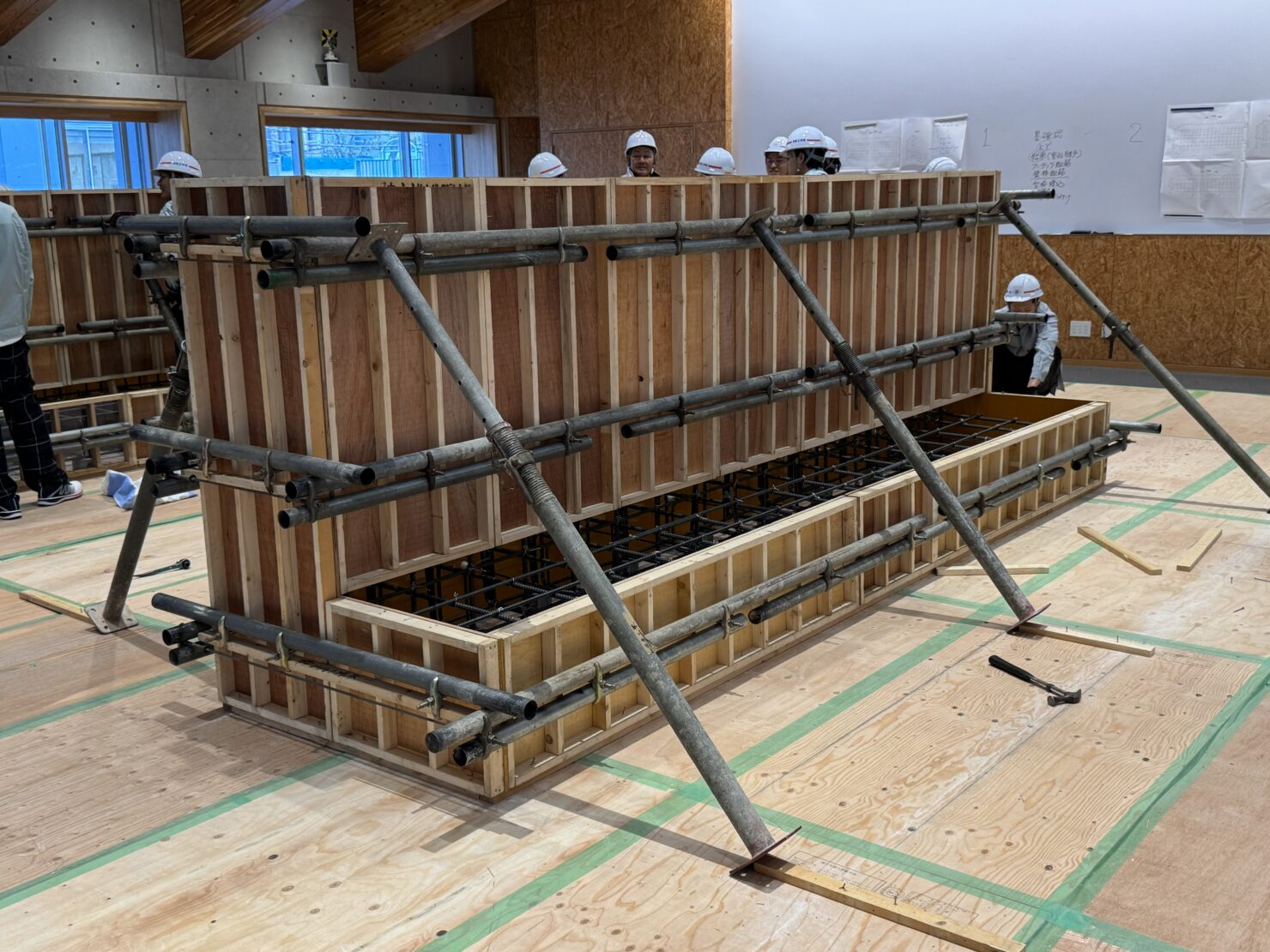 鉄筋の組み立てが終わると、コンクリートを流し込むための型枠を組み立てます。