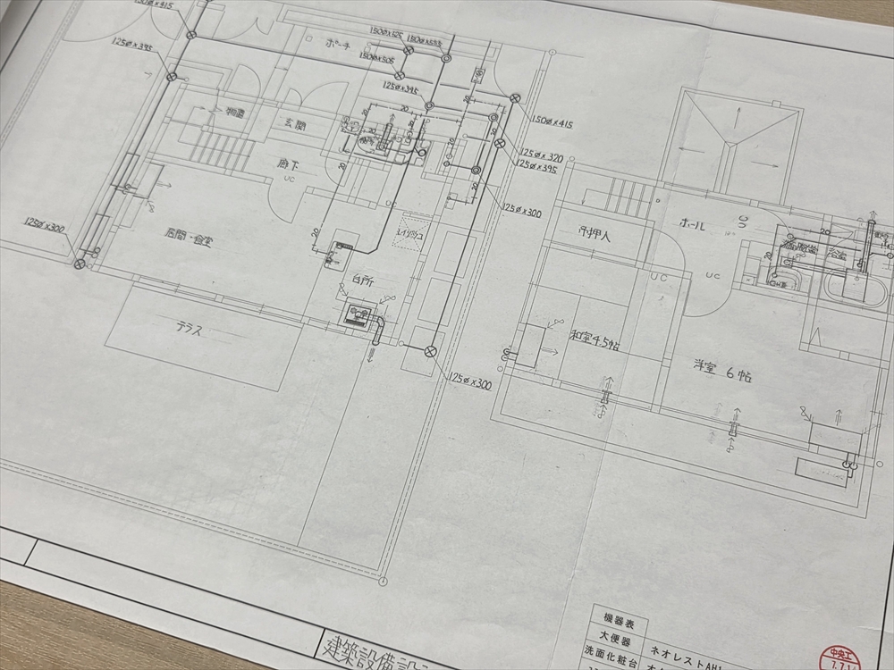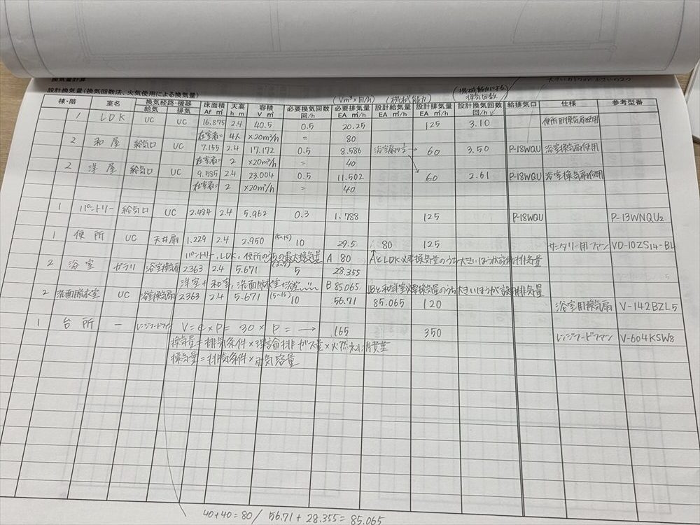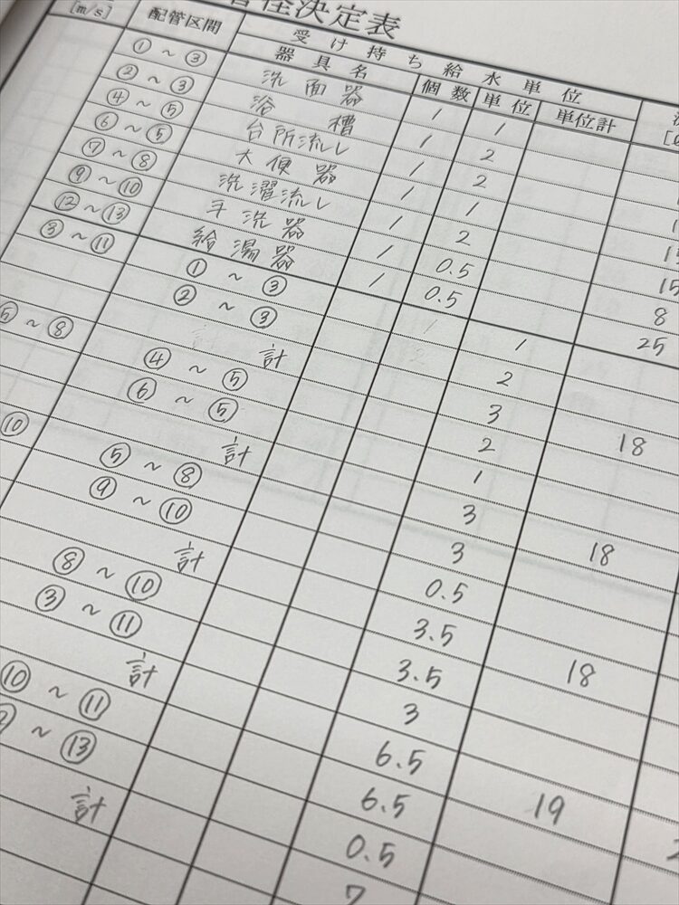 設計作業では計算書を作成します。配管のサイズや桝の大きさ、エアコンの能力選定、換気量の計算など、多種多様な設計を行います。