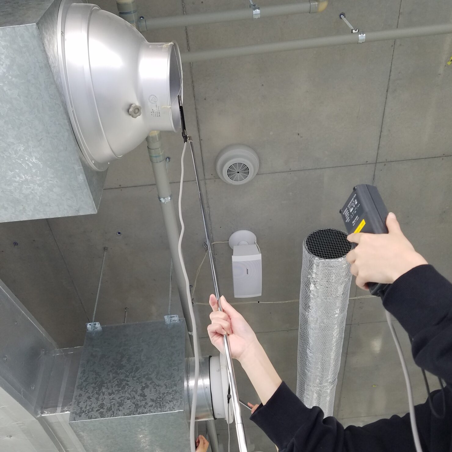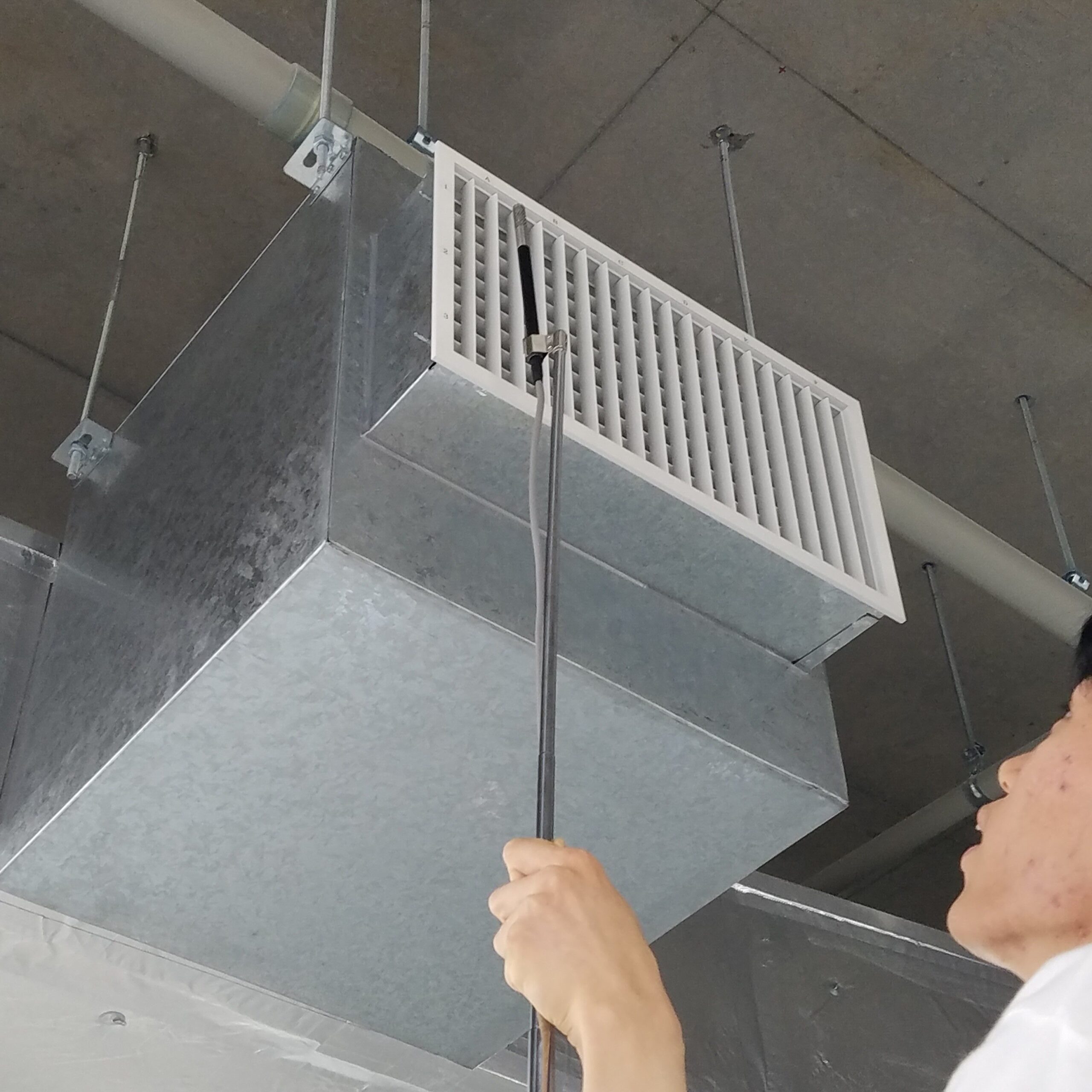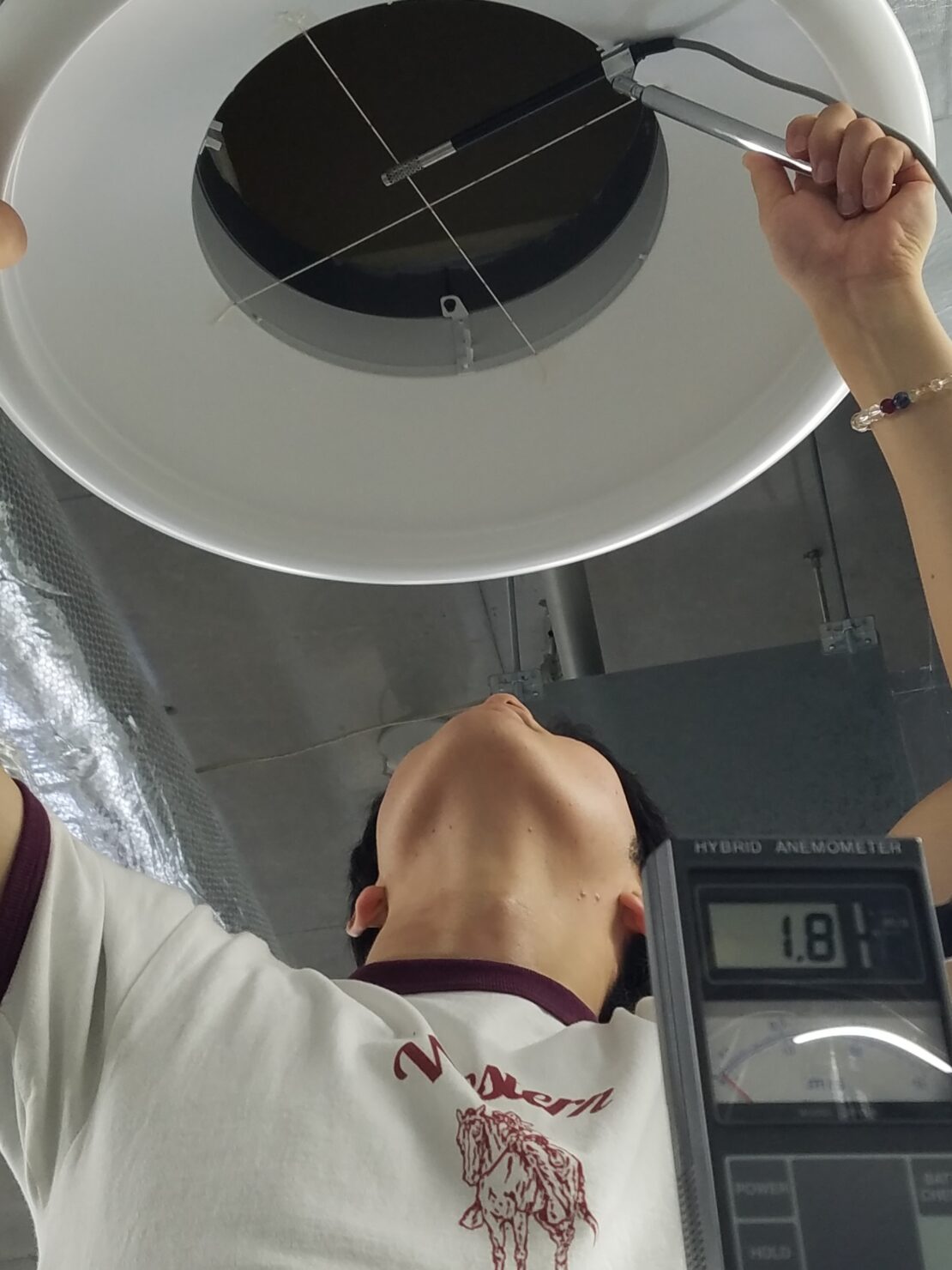 風速から送風量を計算し、温度設定の上で空調機器の能力を算出する。風速計を使用して各吹出口からの風速を測定中。