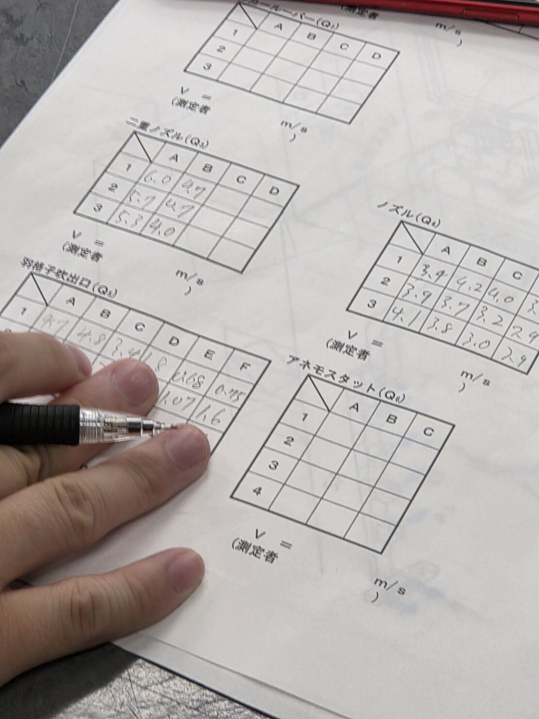 今回の測定は、吹出口からの風速。風速から送風量を計算し、温度設定の上で空調機器の能力を算出する。
