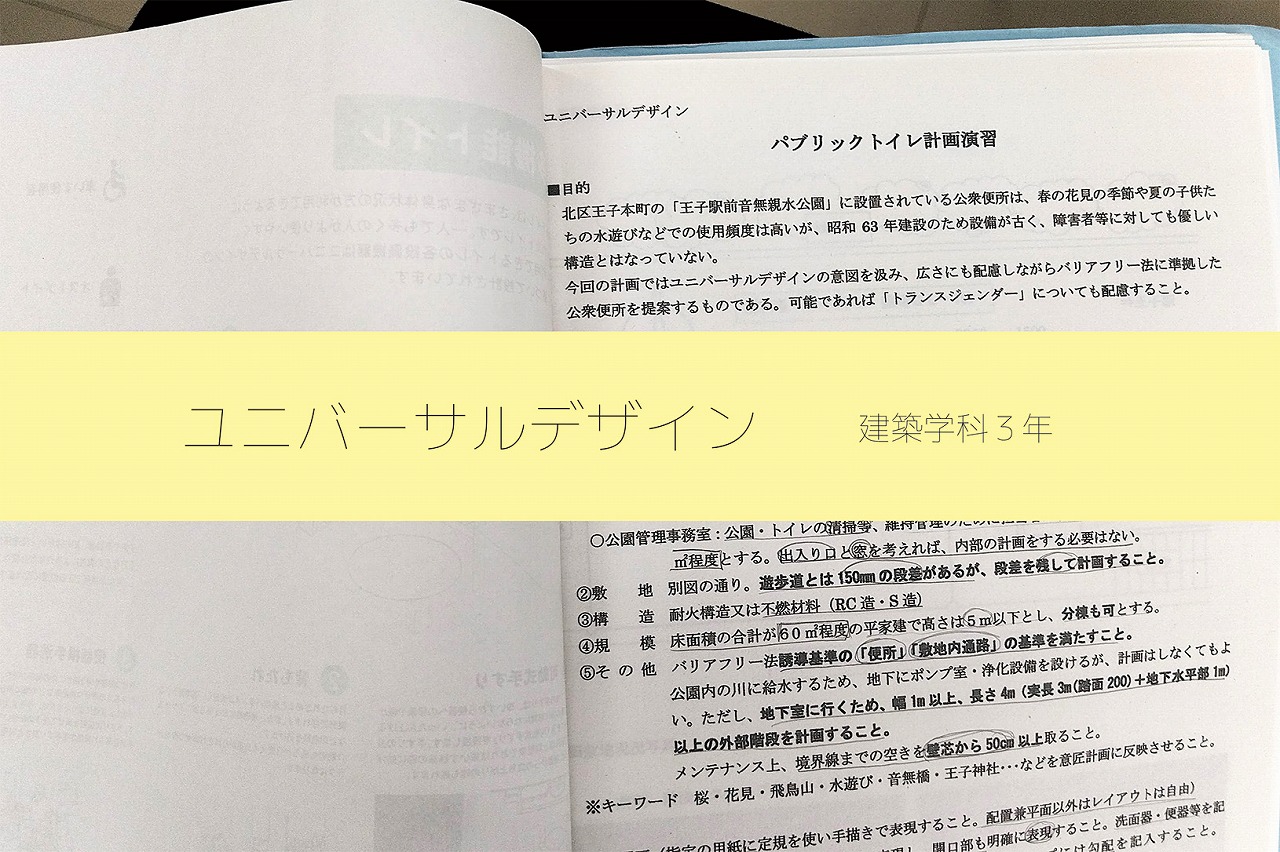 高齢社会の現状を踏まえ、ユニバーサルデザインやバリアフリーの在り方を習得することを目的に、建築学科3年生では「ユニバーサルデザイン」という科目を履修していきます。