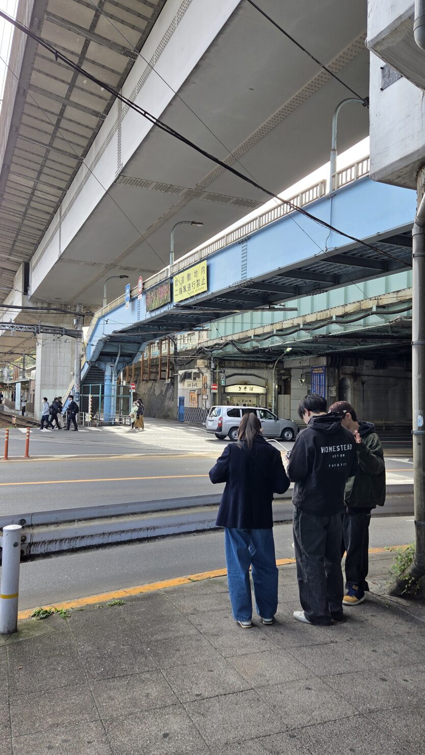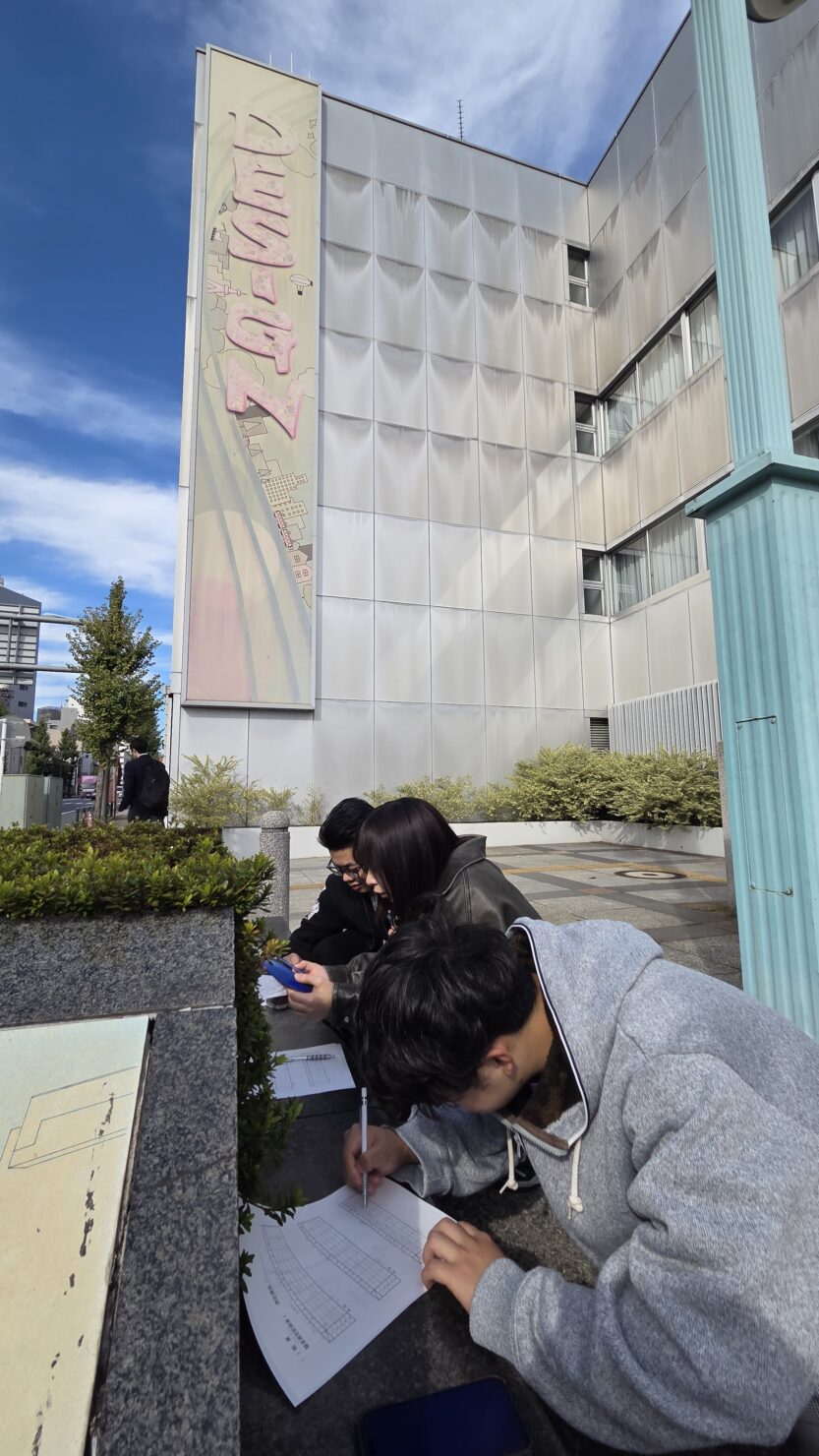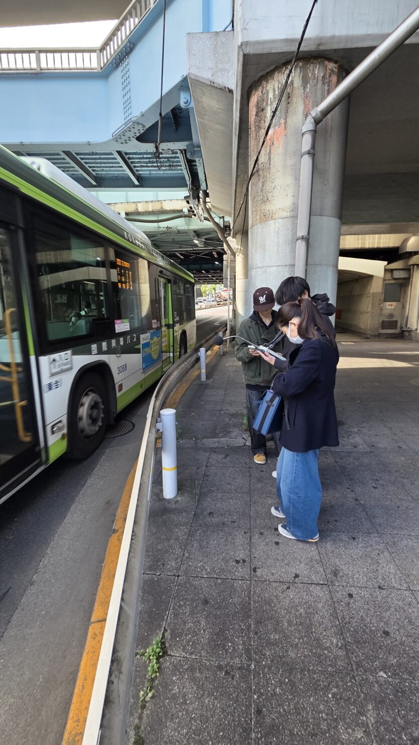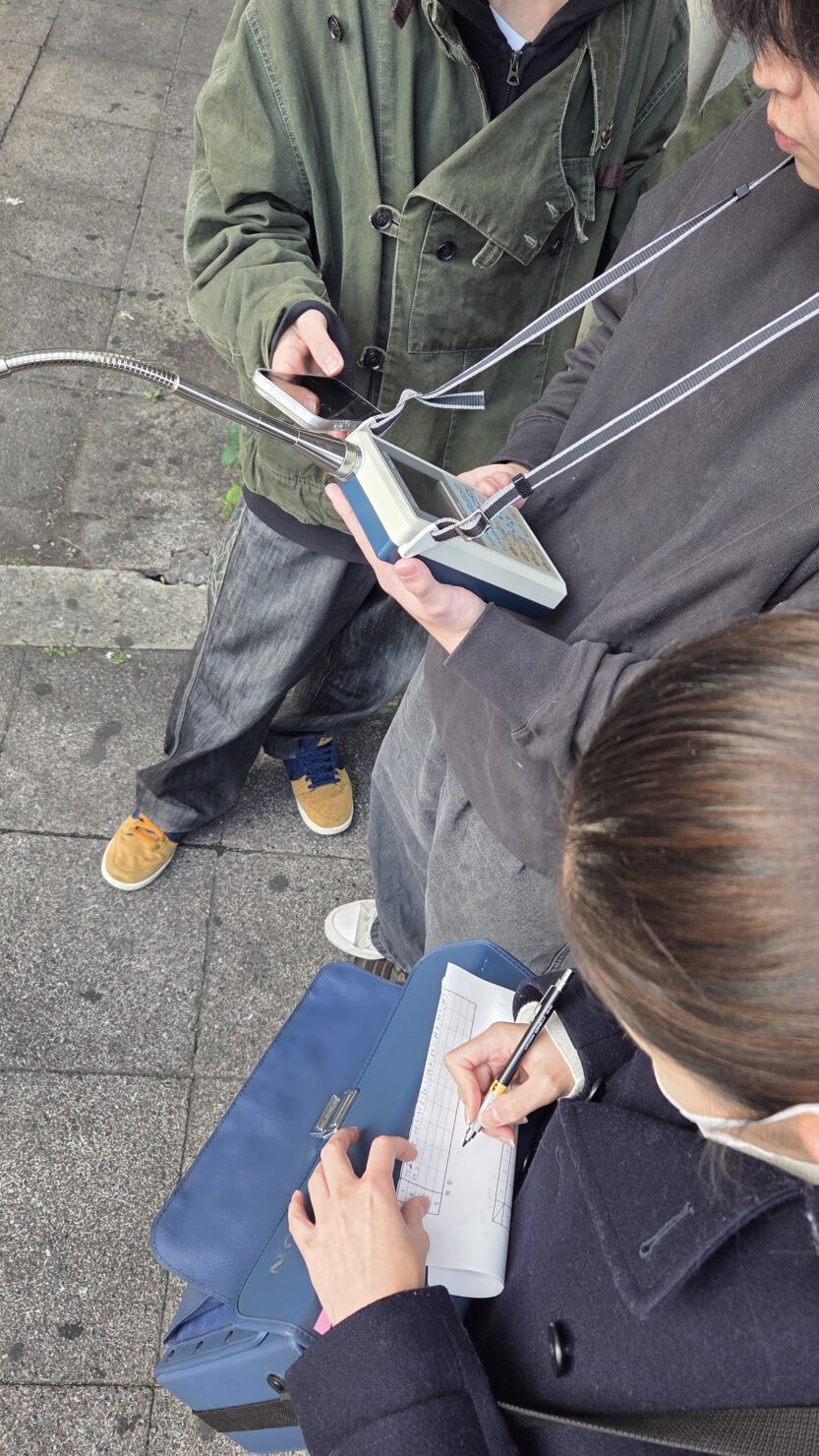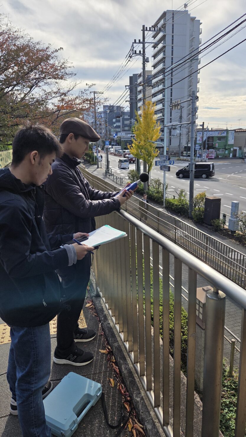 学校周辺の道路騒音を測定するため、学外へ移動。道路騒音・環境騒音を測定し、測定点での騒音状況を把握します。