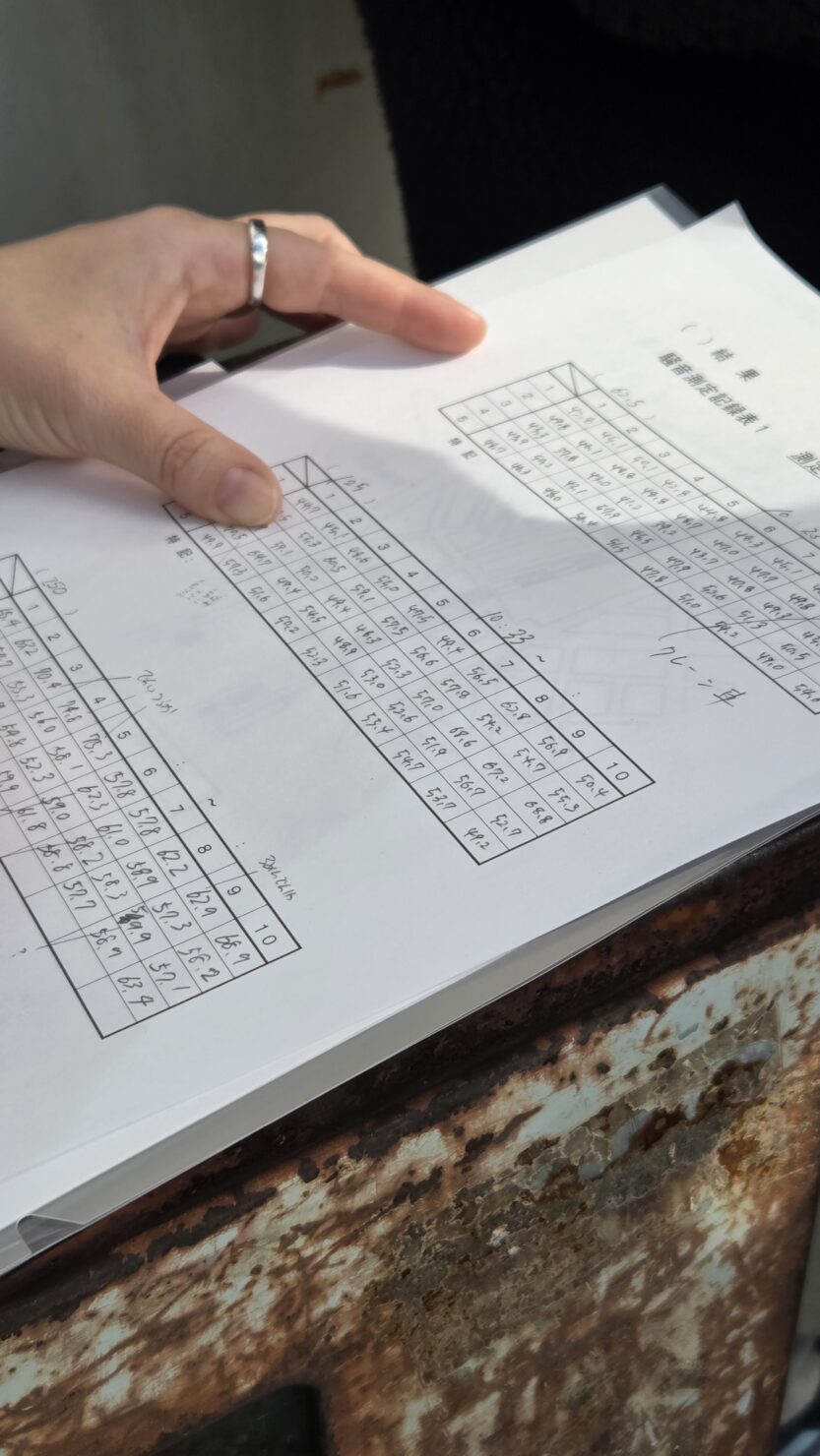 各測定点では、騒音測定や周波数別音響測定を行い、データを集計します。建物建設における騒音について、状況・分析・対策の検討を行うことが目的です。