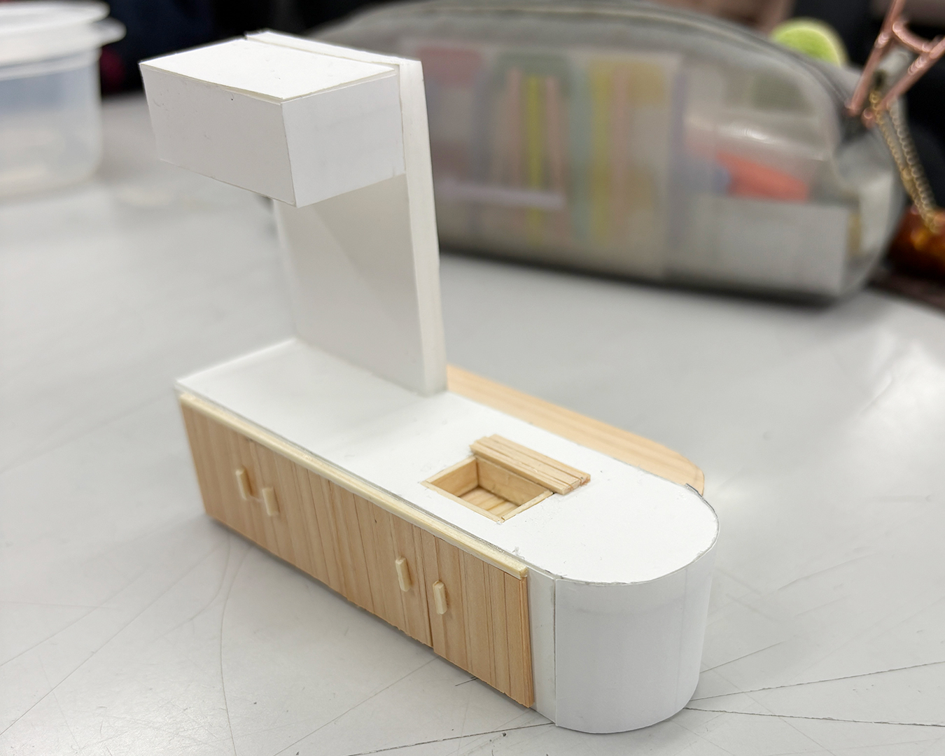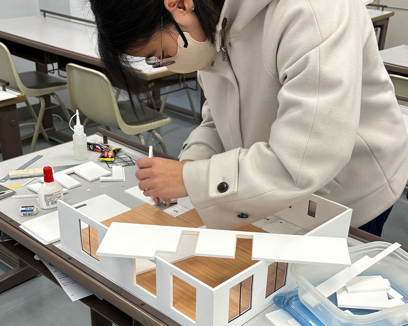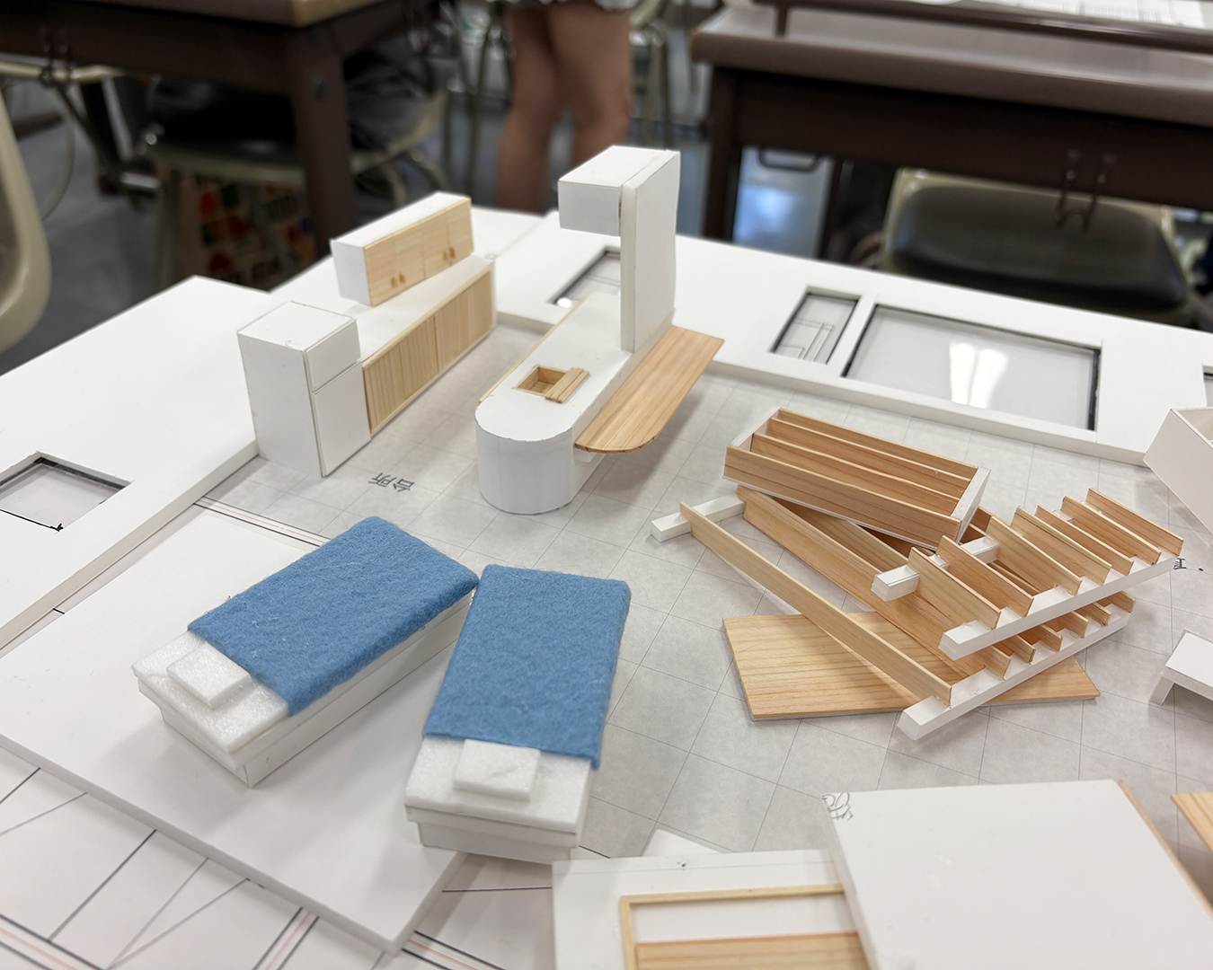 ひとつの授業だけで完結するのではなく、CAD製図の授業でプレゼンテーションボード制作やパース合成作業などを徹底サポートし、インテリアエレメントの授業で模型制作をフォローするなど、科目横断型で取り組みます。週5日のうち約2.5日がこの課題に充てられ、学生たちは一つのテーマに深く集中できる環境で制作に向き合いました。