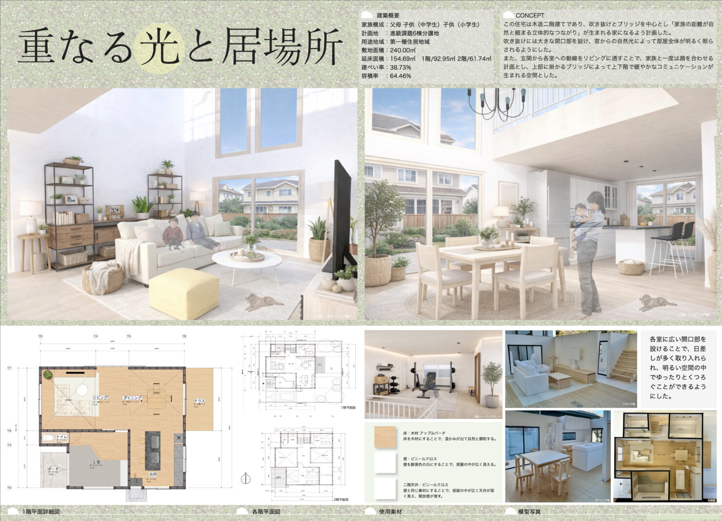 与えられた条件のもと、木造2階建て専用住宅を設計。提出物は、