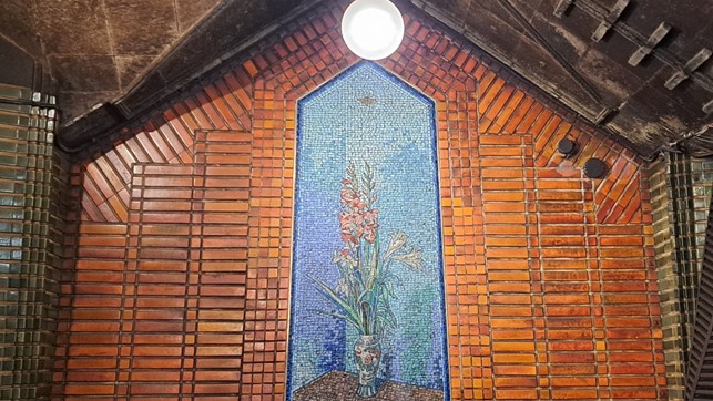 中でも正面のガラスモザイクによる壁画は圧巻。