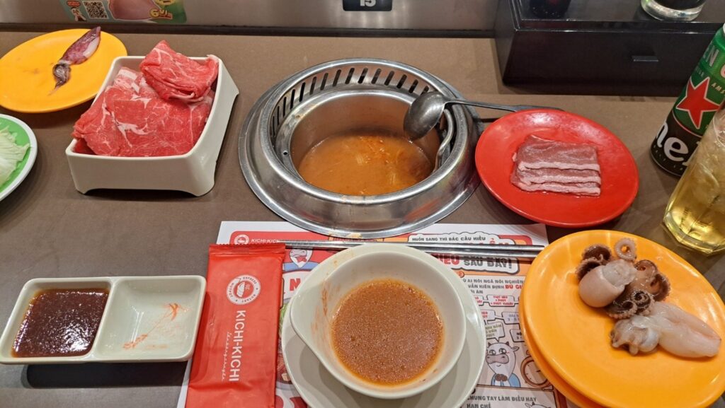 例えばトムヤムクン味など(私は味噌味)。ほどよく煮えたぎったところで回転テーブルから具材を選び鍋に投入。
